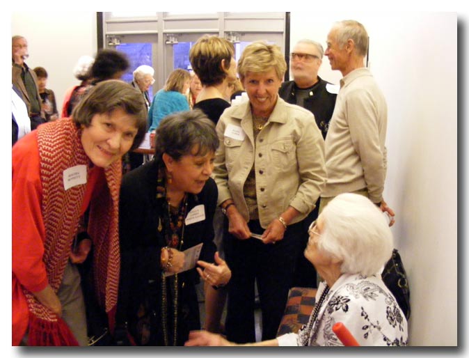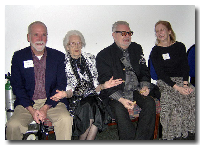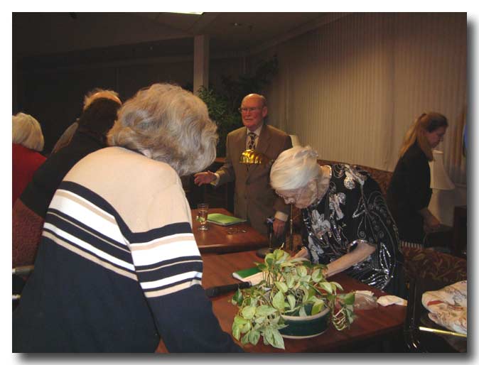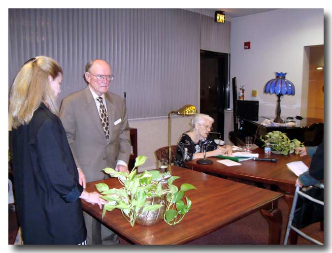 Mom in the "Green Room" before the performance. | Norma presented Mom and Glenn to the audience. The stage was two tables representing two locations as each actor read their old letters exchanged over the years of their divergent lives. | After the performance, Glenn and Mom spent no small amount of time autographing programs for the audience. | And after all said and done, Norma, Glenn, and Mom congratulate each other on a fantastic presentation. | ||