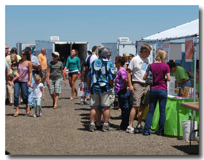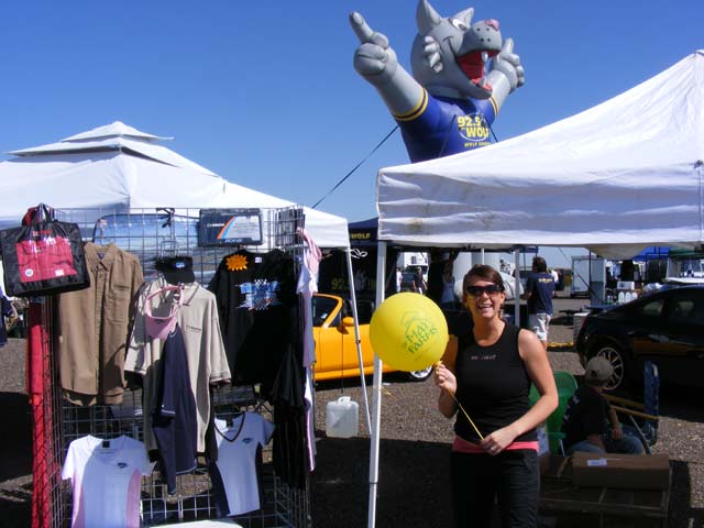 The Event Staff was well prepared in the HPR Booth to receive the thousands of folks wishing to buy donation rides, tour rides, HPR regalia, and answer questions. | About ten o'clock the crowds started gathering. | And continued to swarm the paddock and all the vendors all day long. | Krista May (of May Farms fame) is dwarfed by the 92.5 Wolf in the background. |