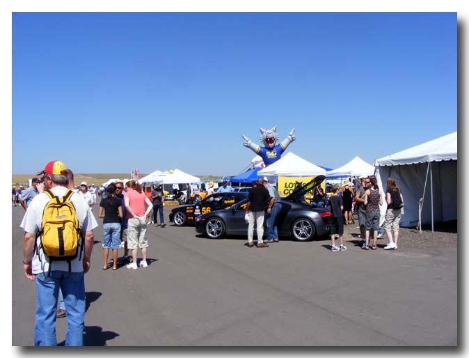 Donations for rides in exotic cars was a huge success, with rides in all the exotics sold out. Of course, rides in the Harry Mathews' McLaren Can-Am car were, as one happy rider said, "The best damn $250 I ever spent in my entire life." | No doubt Greg Mathews gave all the riders the ride of their life. Other exotic rides (all sold out) included Porsches, Camero, a Audi R8 and others. | :The guys with the big cars have all the fun. Not sure if this is "Thanks for a great ride!" or "Please don't kill me." | During the day the paddock was jam packed with spectators. Crowd estimates for the entire day range from 3,000 to 4,000 people. Many were first time visitors to the track and were, undoubtedly, bitten by the HPR bug to become future road racing junkies. |
